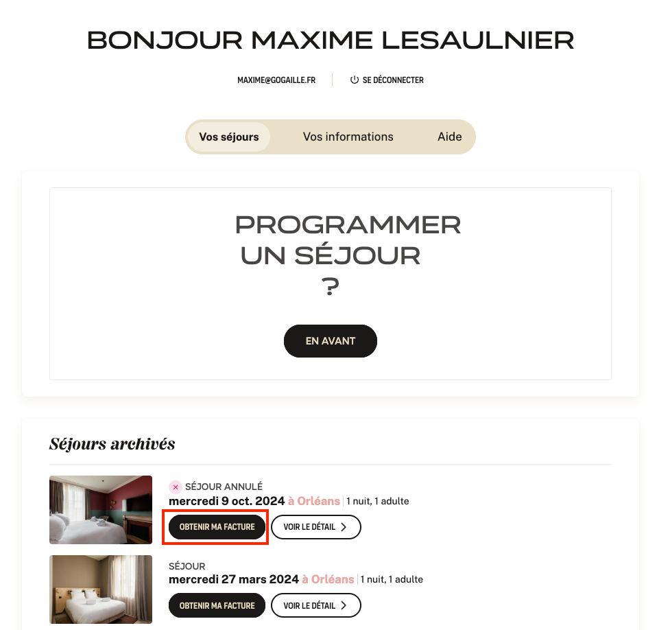 Dans vos séjours archivées, cliquez sur