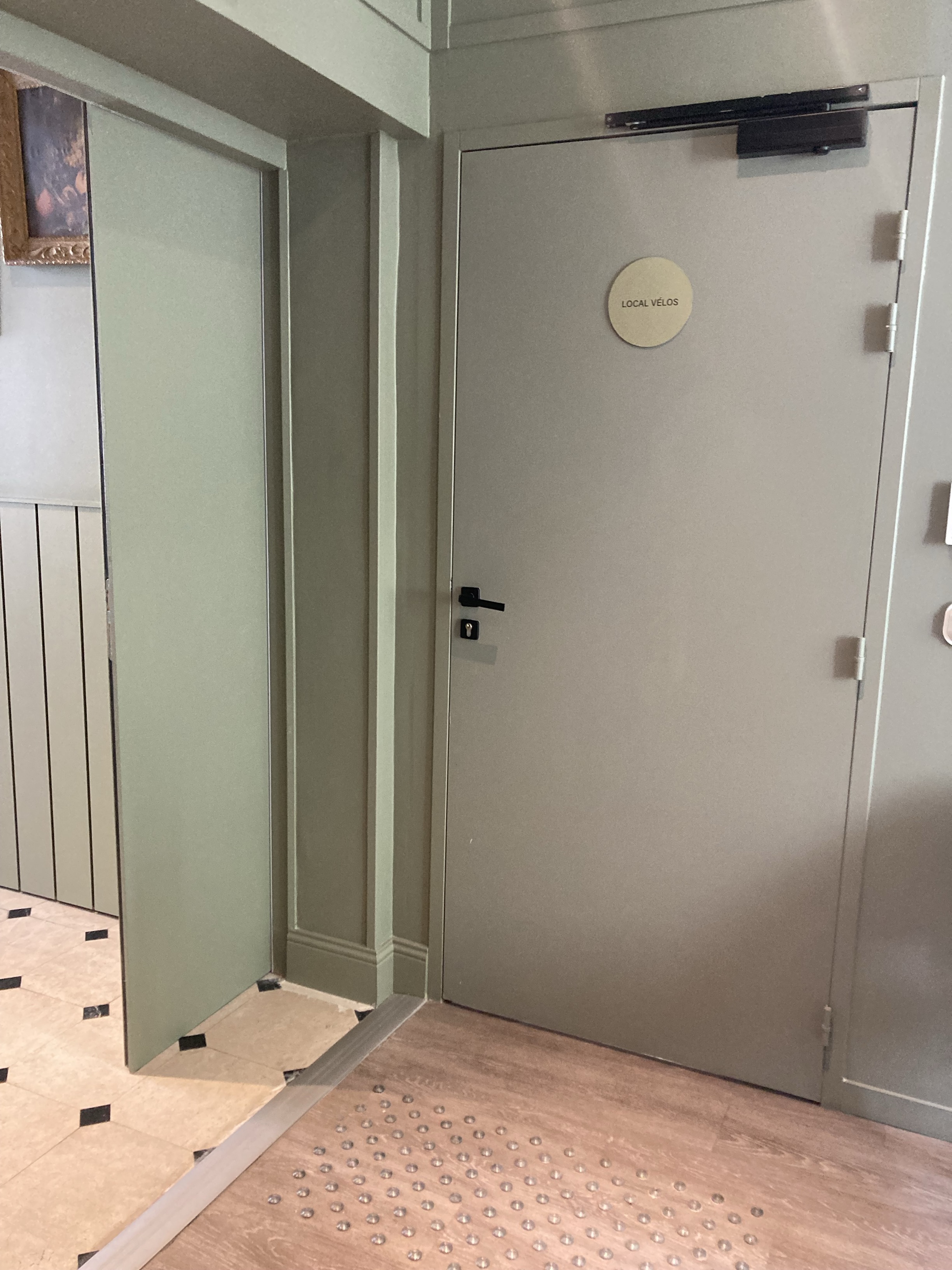 Pour ouvrir le parking vélo, il faut entrer dans le garage par la porte qui se situe dans le salon.